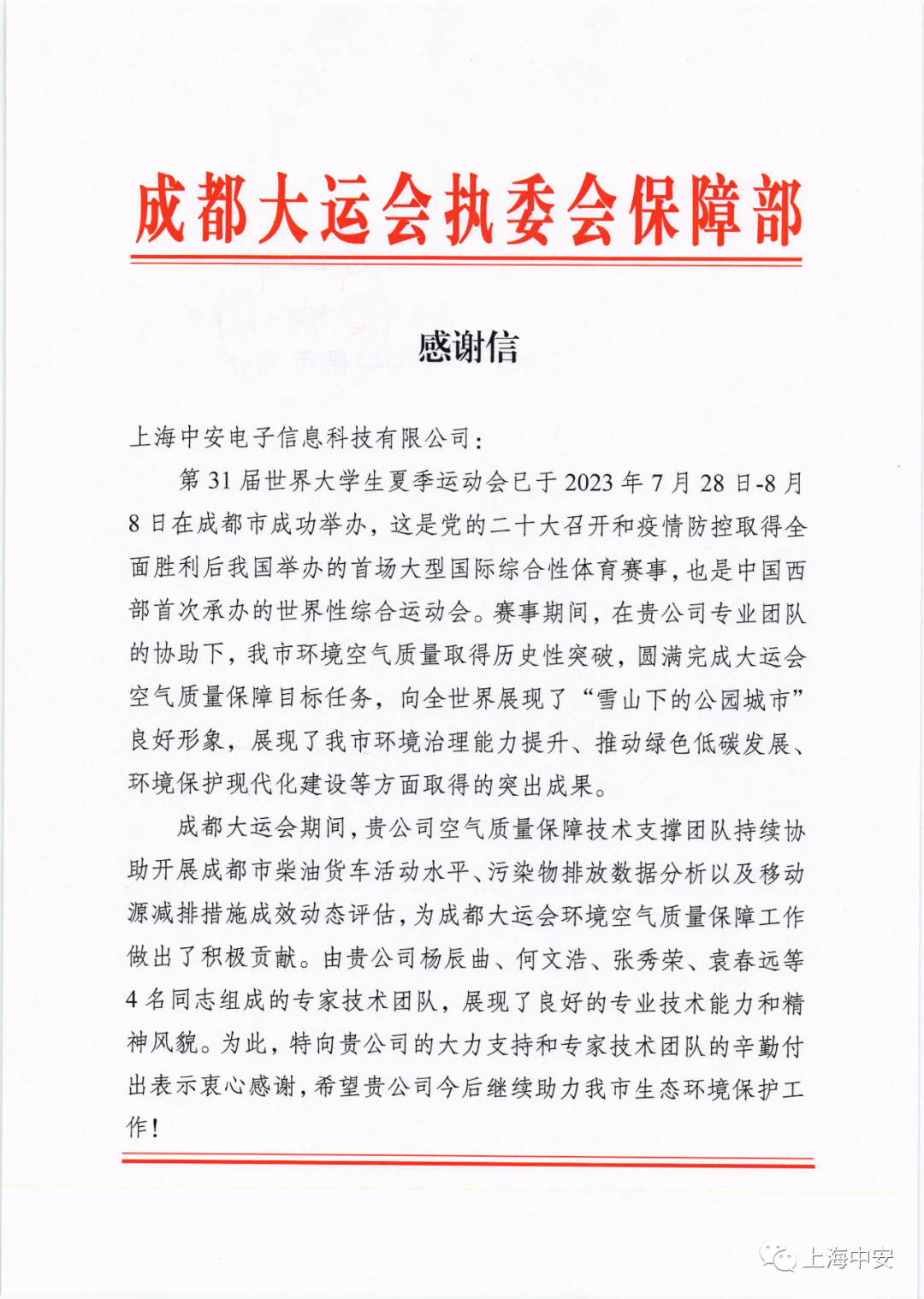 成都大運會執委會保障部發來一封感謝信?。?023-10-15)